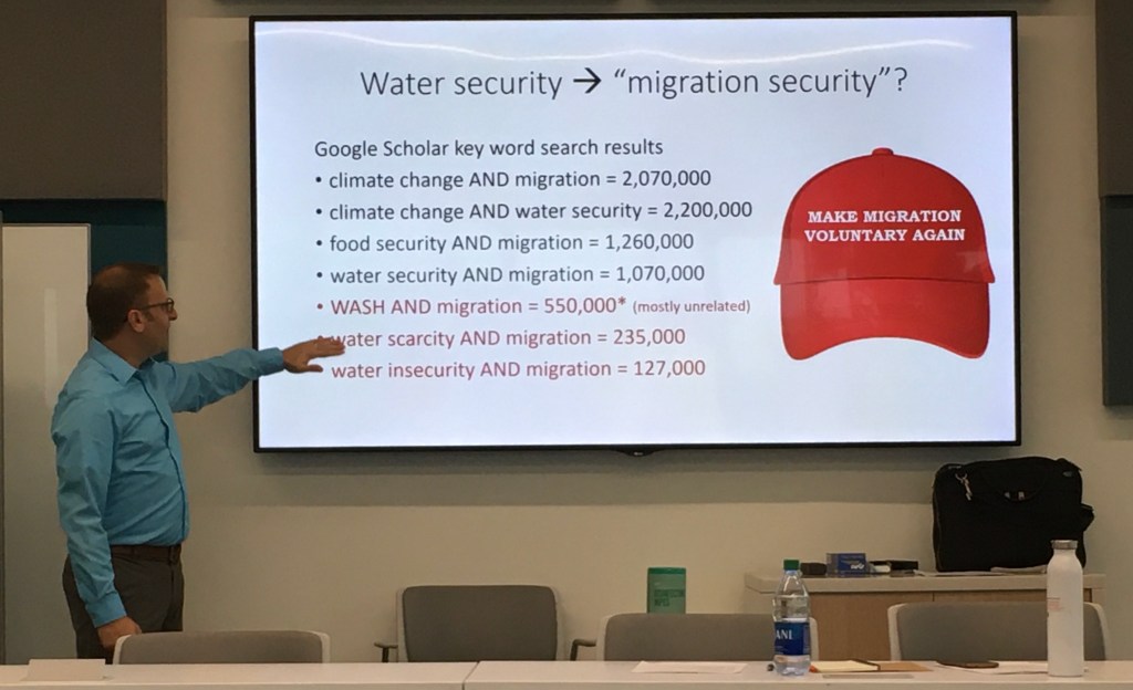 Last week I attended a workshop on the relationship between climate change, water insecurity, and migration. Water insecurity is sorely under-researched, and much of the action at the workshop was about how to integrate recent advances in measuring household water insecurity with existing knowledge on climate and migration.